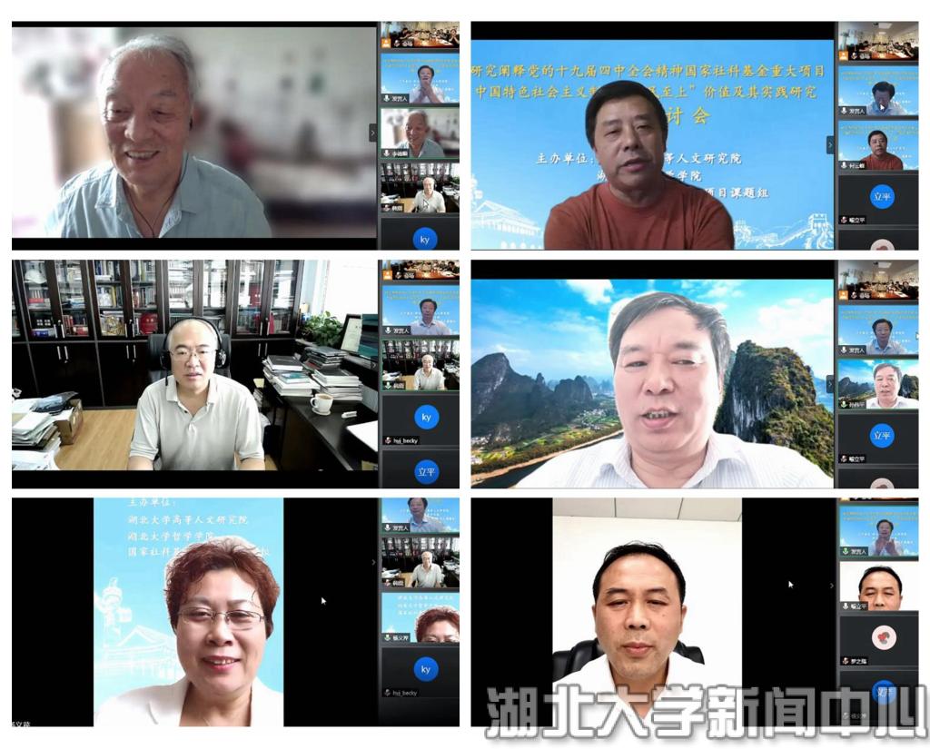 7月10日, 国家社科基金“研究阐释党的十九届四中全会精神”重大项目“中国特色社会主义制度‘人民至上’价值及其实践研究”举行开题研讨会。会议采取线上线下相结合的形式进行,湖北省社会科学界联合会党组书记喻立平、中国政法大学终身教授李德顺、北京师范大学韩震教授等国内七名专家学者通过视频方式出席会议并发言。我校校长谢红星出席会议现场并致辞。
